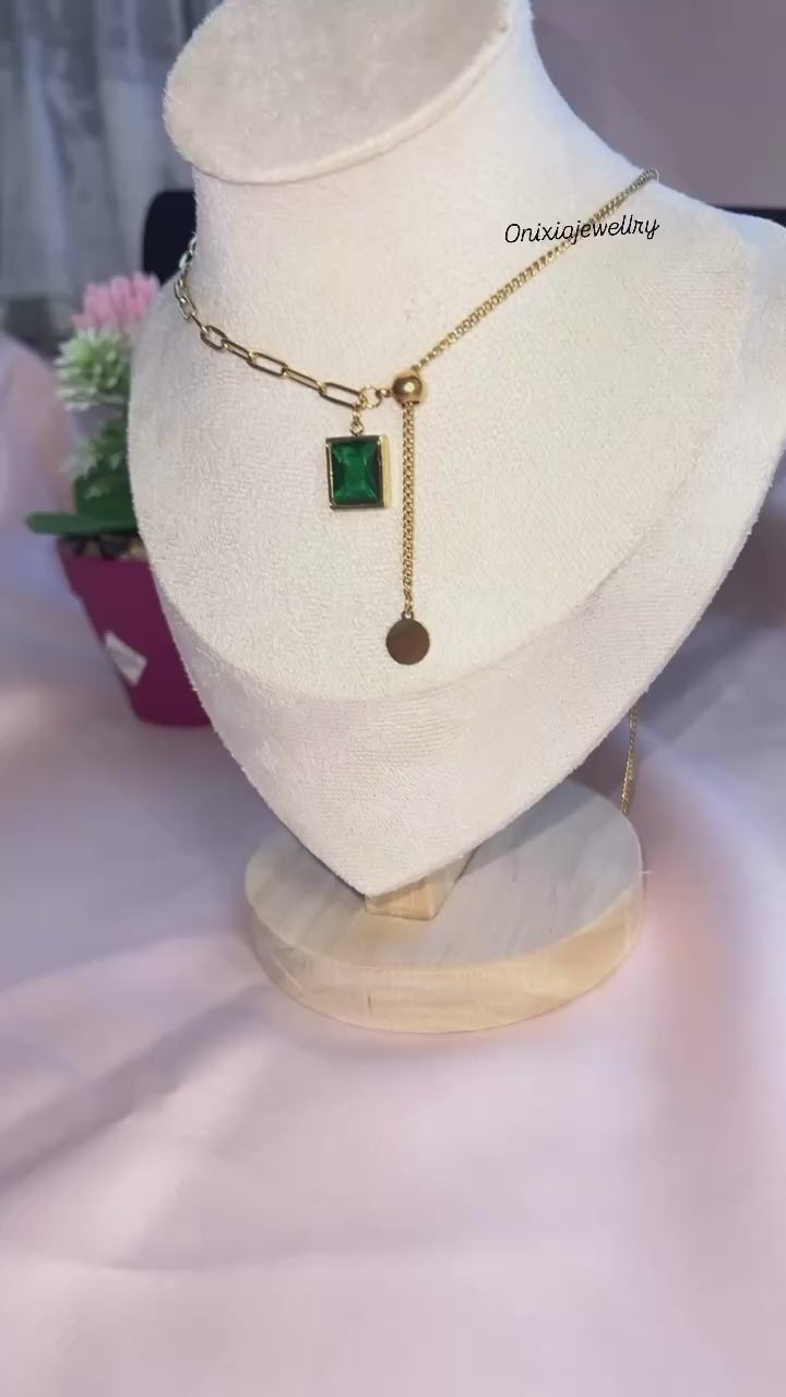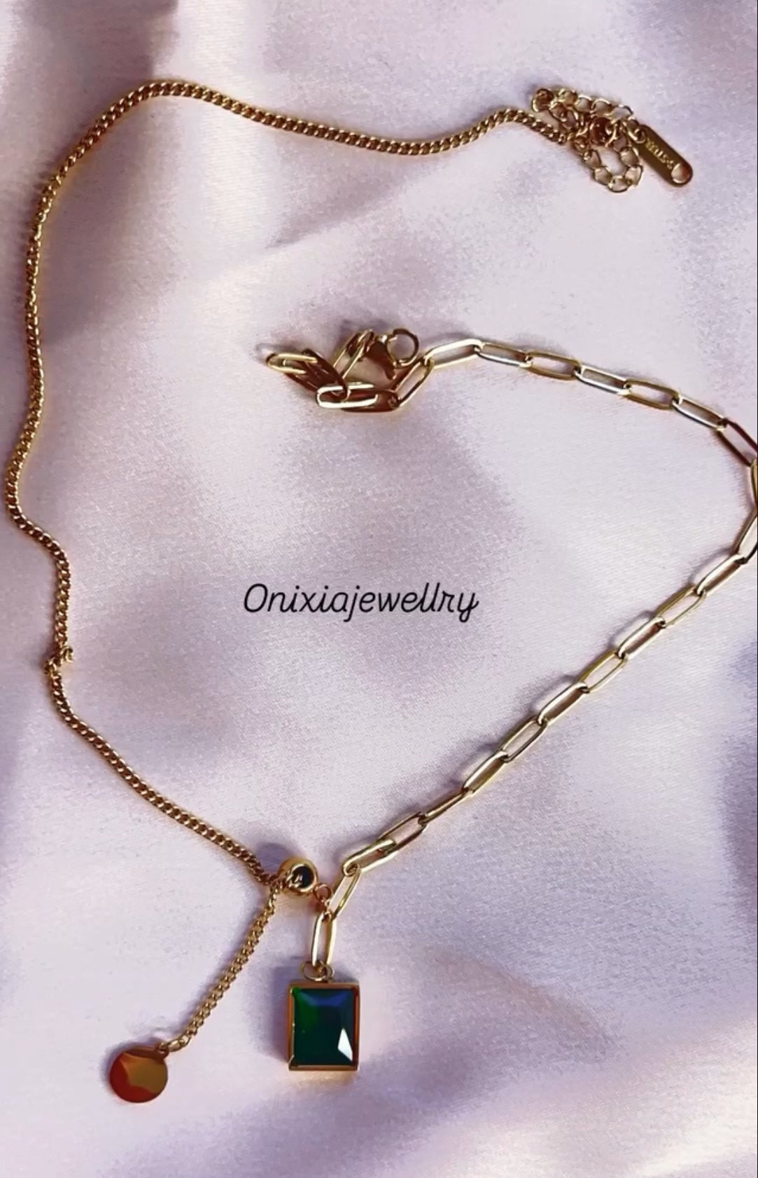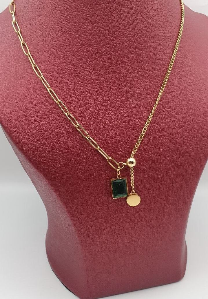 سلسلة ذهبية أنيقة بموتيف مربع مرصّع لون كريستالي أخضر لامع، تضيف لمسة من الجاذبية والفخامة لإطلالتك. 💚