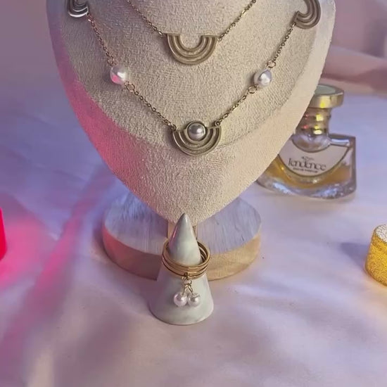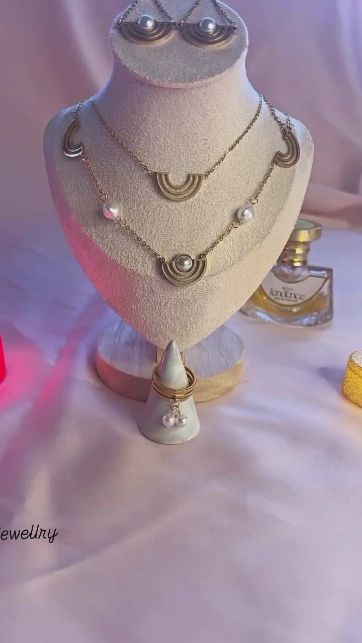 طقم أنيق من 4 قطع بتصميم هندسي عصري مزين بلمسات لؤلؤية ساحرة: سلسلة، سوار، أقراط وخاتم، جميعها بلون ذهبي فاخر يضفي على إطلالتك توازنًا بين البساطة والفخامة. مثالي لكل مناسبة تمنحين فيها نفسك لمسة من التميز والجمال. 💛