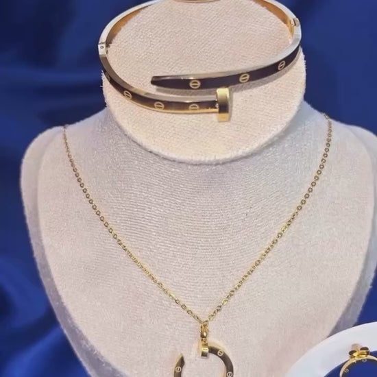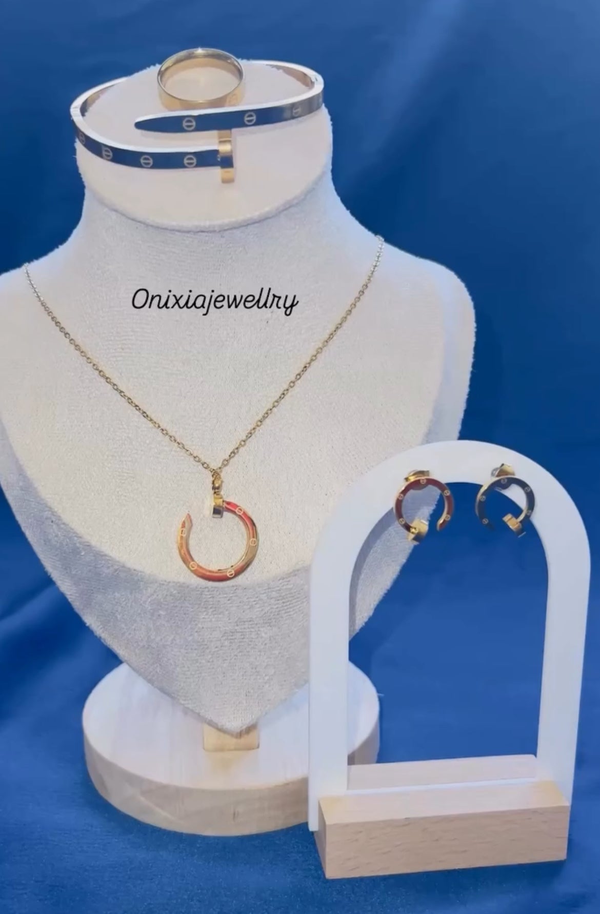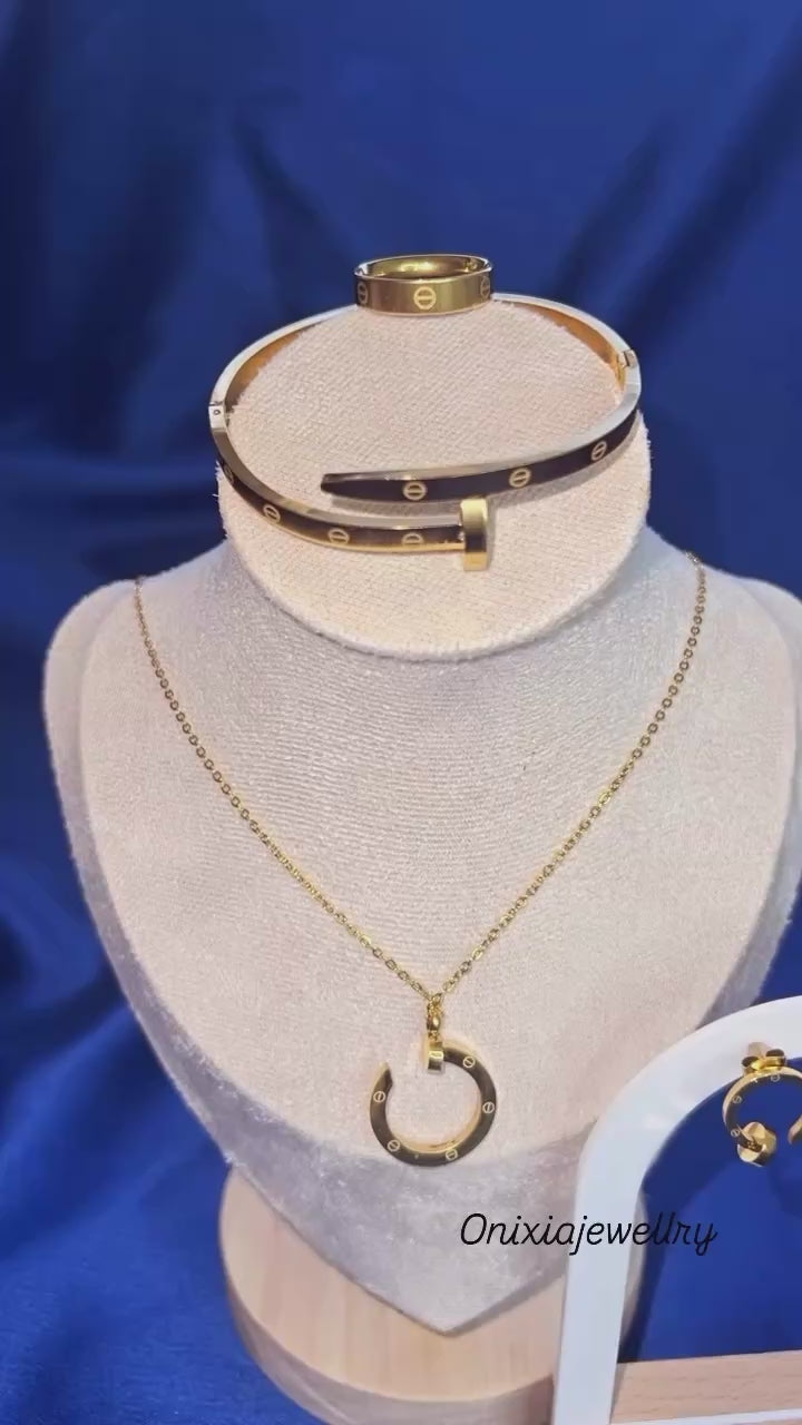 طقم Cartier فاخر مكوّن من 4 قطع أنثوية متكاملة: سلسلة بتصميم راقٍ، أقراط أنيقة، خاتم عصري، وسوار يجمع بين الفخامة والبساطة. طقم مثالي لإطلالة راقية تعكس جمالك بأسلوب Cartier الكلاسيكي الخالد.