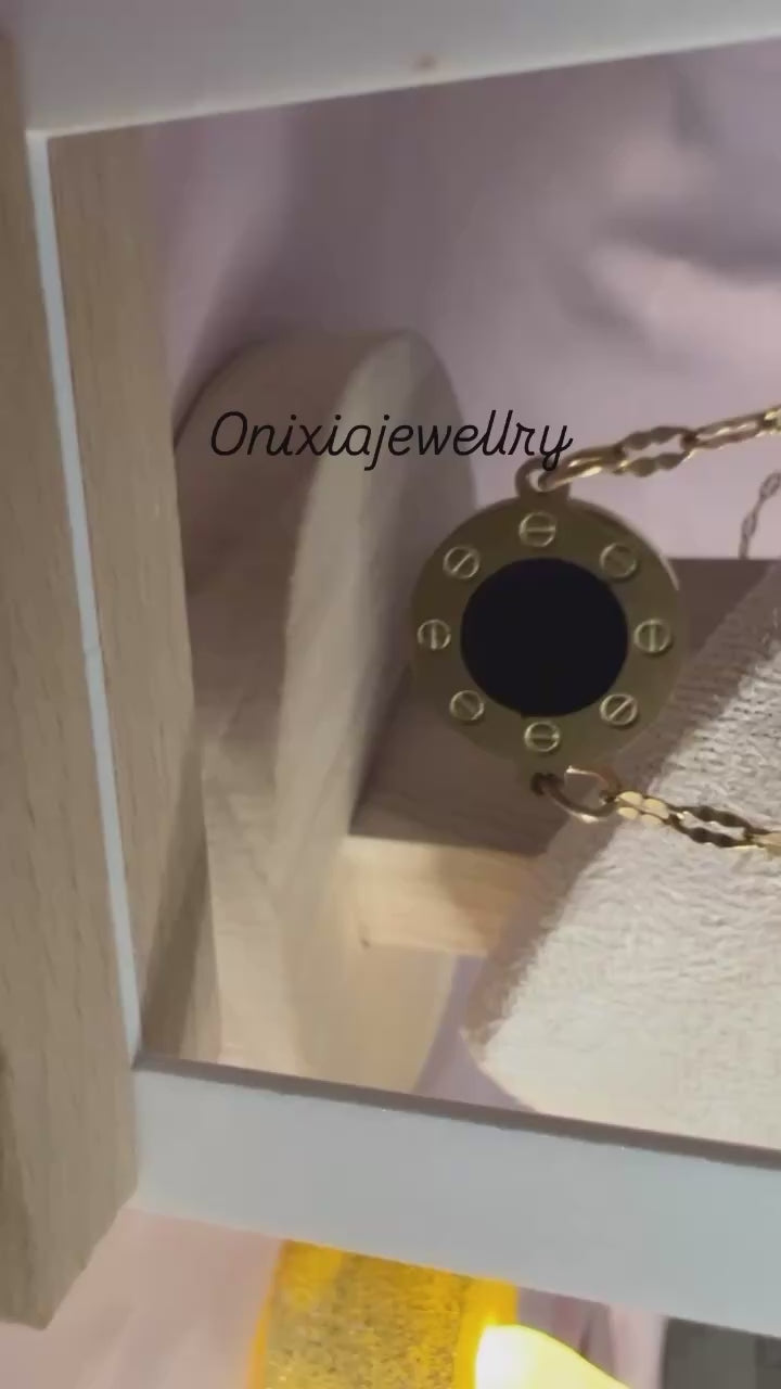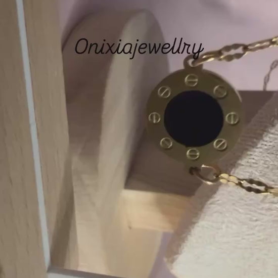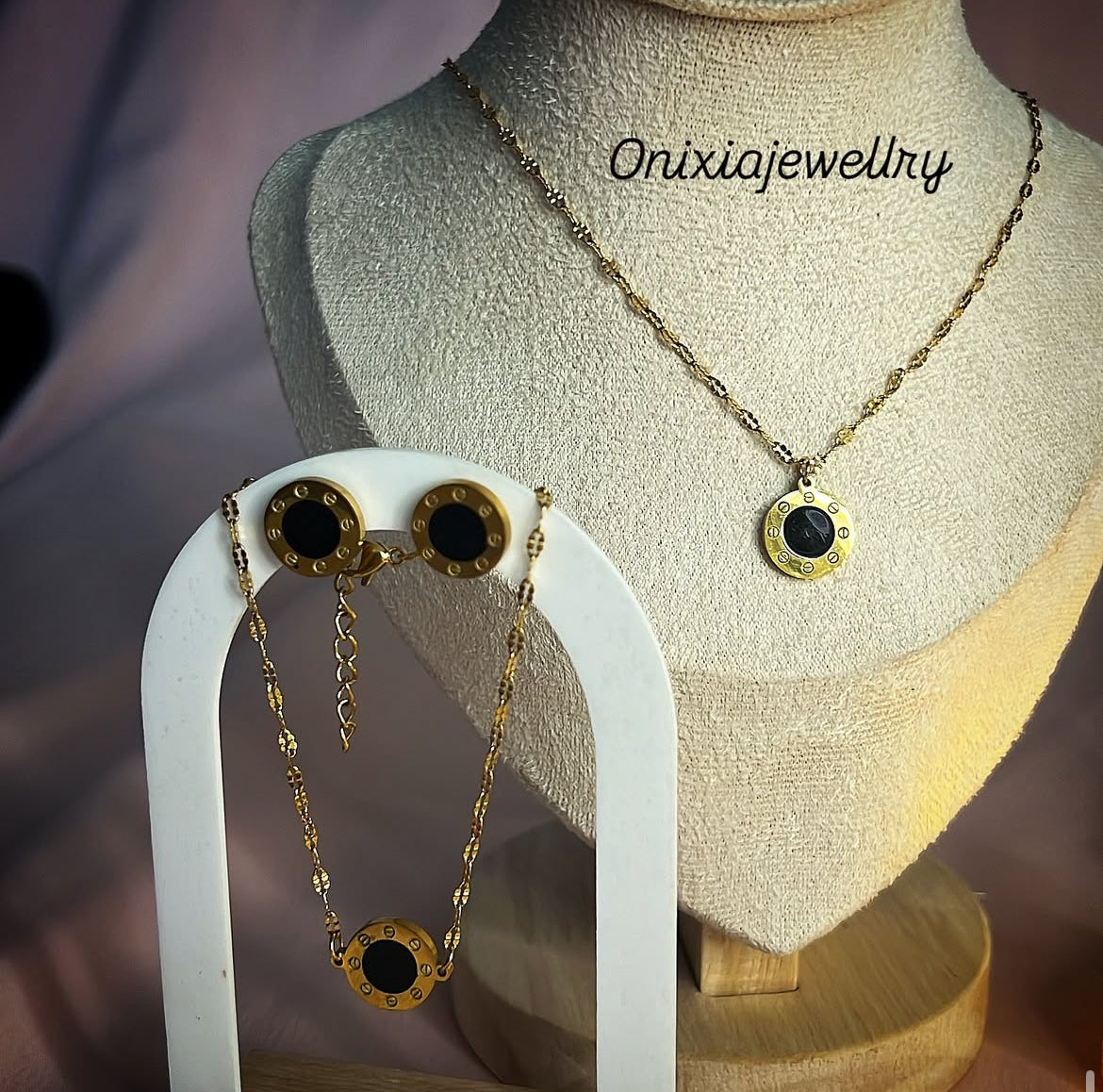طاقم راقٍ من سلسلة وأقراط بتصميم دوائر ذهبية يتوسطها قرص أسود، يمنحك أناقة عصرية وبساطة فاخرة.