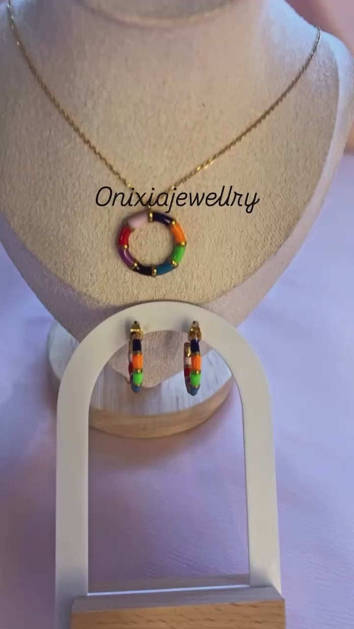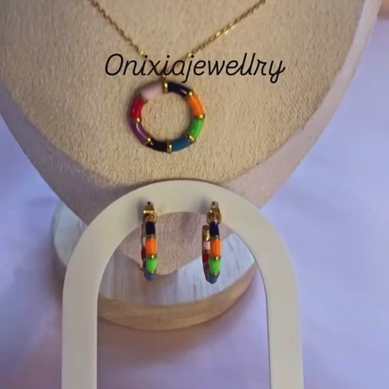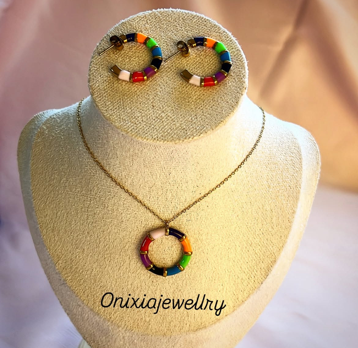 طقم أنيق مستوحى من حلقة البحارة بتصميم متعدد الألوان، مكوّن من سلسلة وأقراط بلمسة عصرية قريبة من الطابع الإيطالي الفاخر.